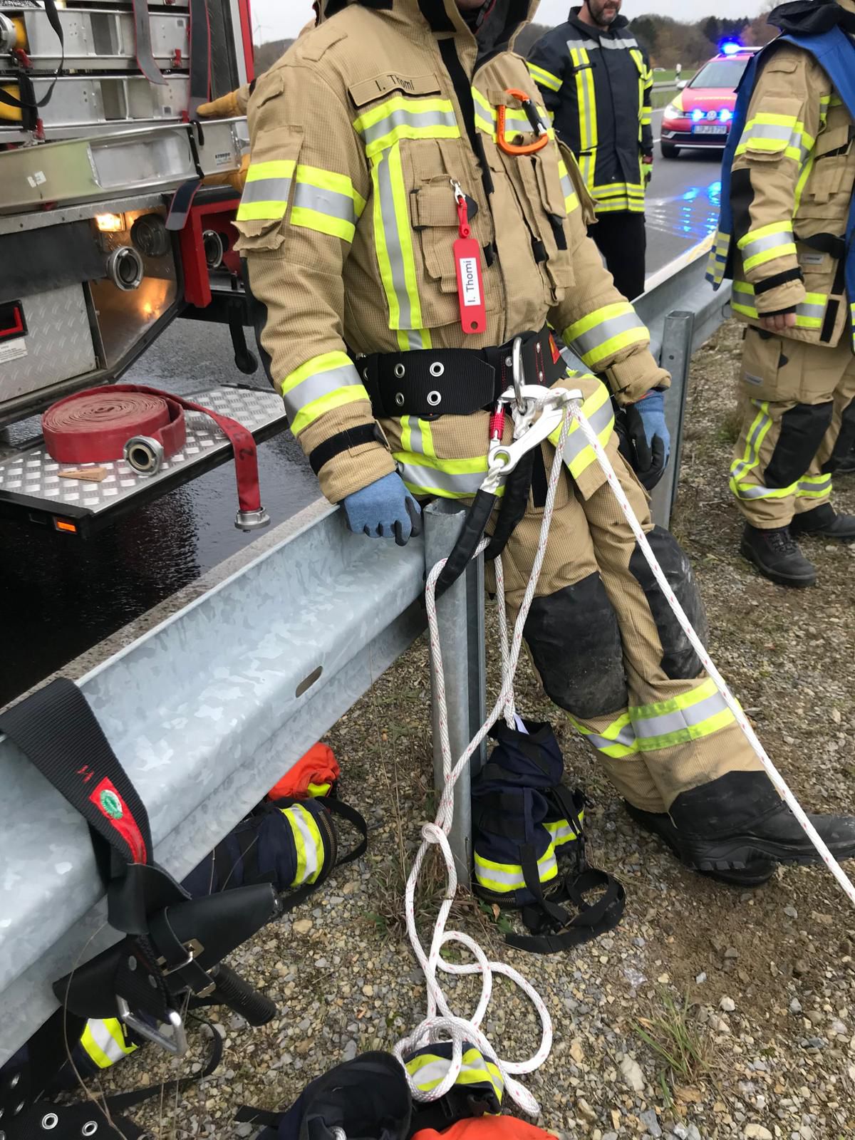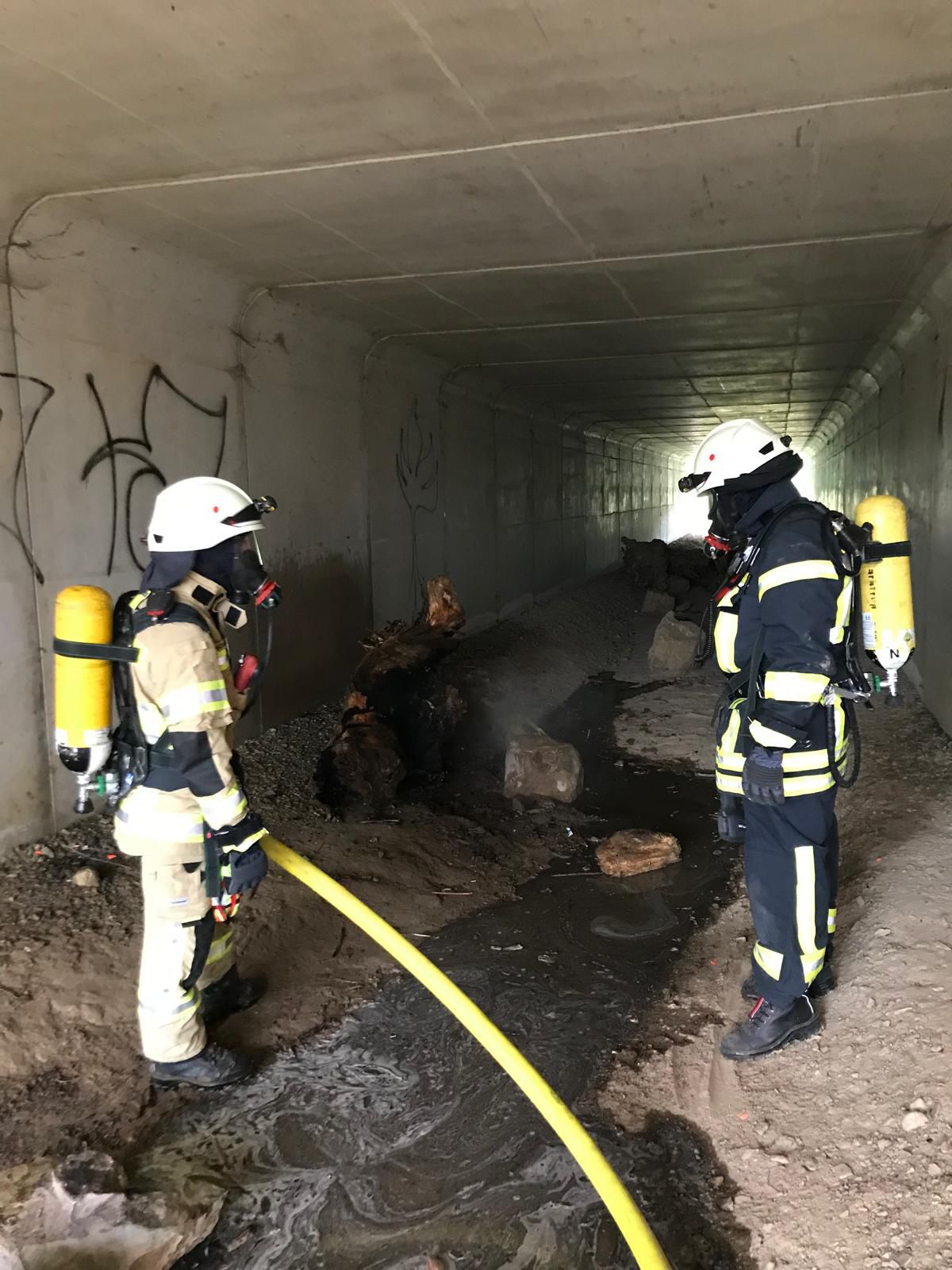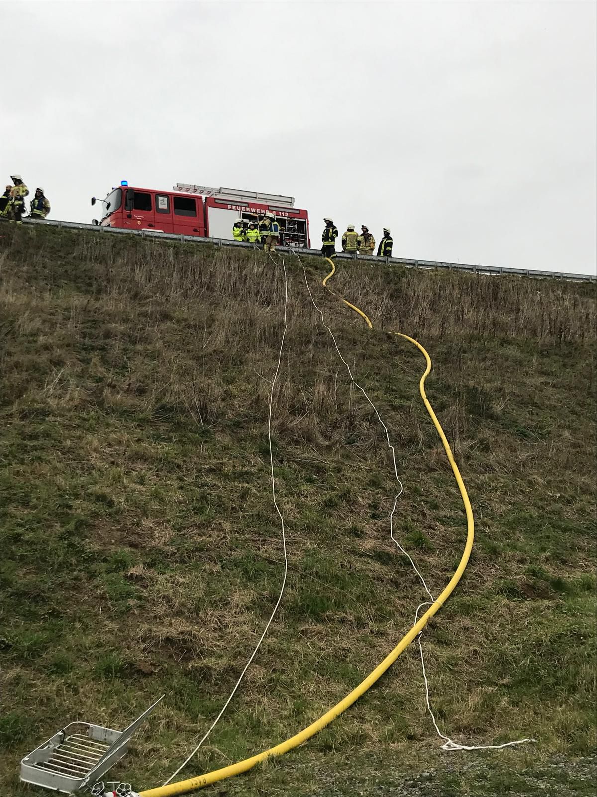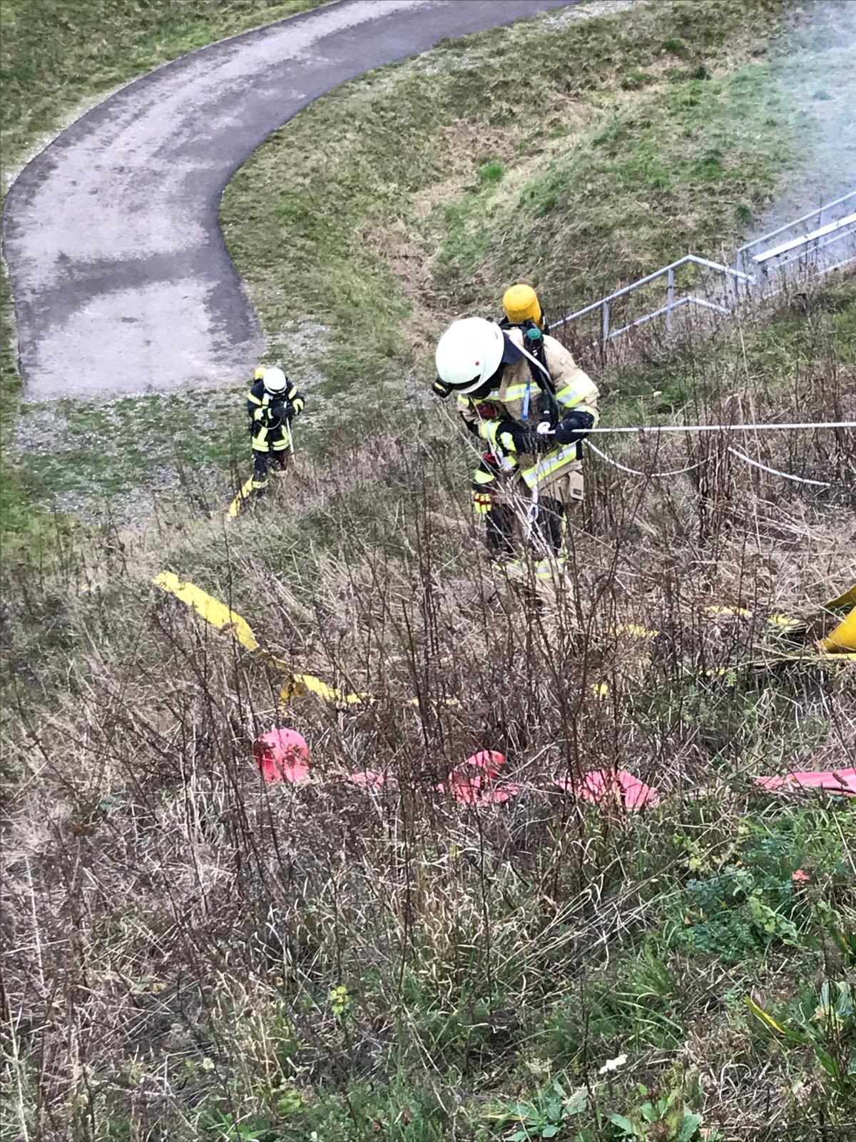 (14.11.2025) Am Freitag Nachmittag alarmierte die Feuerschutz,- und Rettungsleitstelle des Kreises Lippe alle drei Einsatzabteilungen der Feuerwehr Barntrup mit dem Alarmstichwort „Feuer 2, unklare Rauchentwicklung, Rauch aus Tunnel“, auf die B66neu. Aufmerksame Autofahrer sahen aus einer Röhre unterhalb der B66neu Rauch aufsteigen und setzten folgerichtig den Notruf ab. Der erst eintreffende Kommandodienst und die Polizei erkundeten einen brennenden Baumstamm in dem Röhrensystem. Da keine größere Gefahr davon ausging, wurden einige anrückende Einsatzkräfte zurück alarmiert. Die zwei weiter eintreffenden Einsatzfahrzeuge sicherten die Einsatzstelle gegen den fließenden Verkehr ab und legten eine Wasserleitung den Hang hinunter vor die Röhre. Ein Atemschutztrupp ging gesichert den Hang hinunter und löschte den brennenden Baumstamm mit einem C Rohr ab. In den Standorten wurde die Einsatzbereitschaft wieder hergestellt.