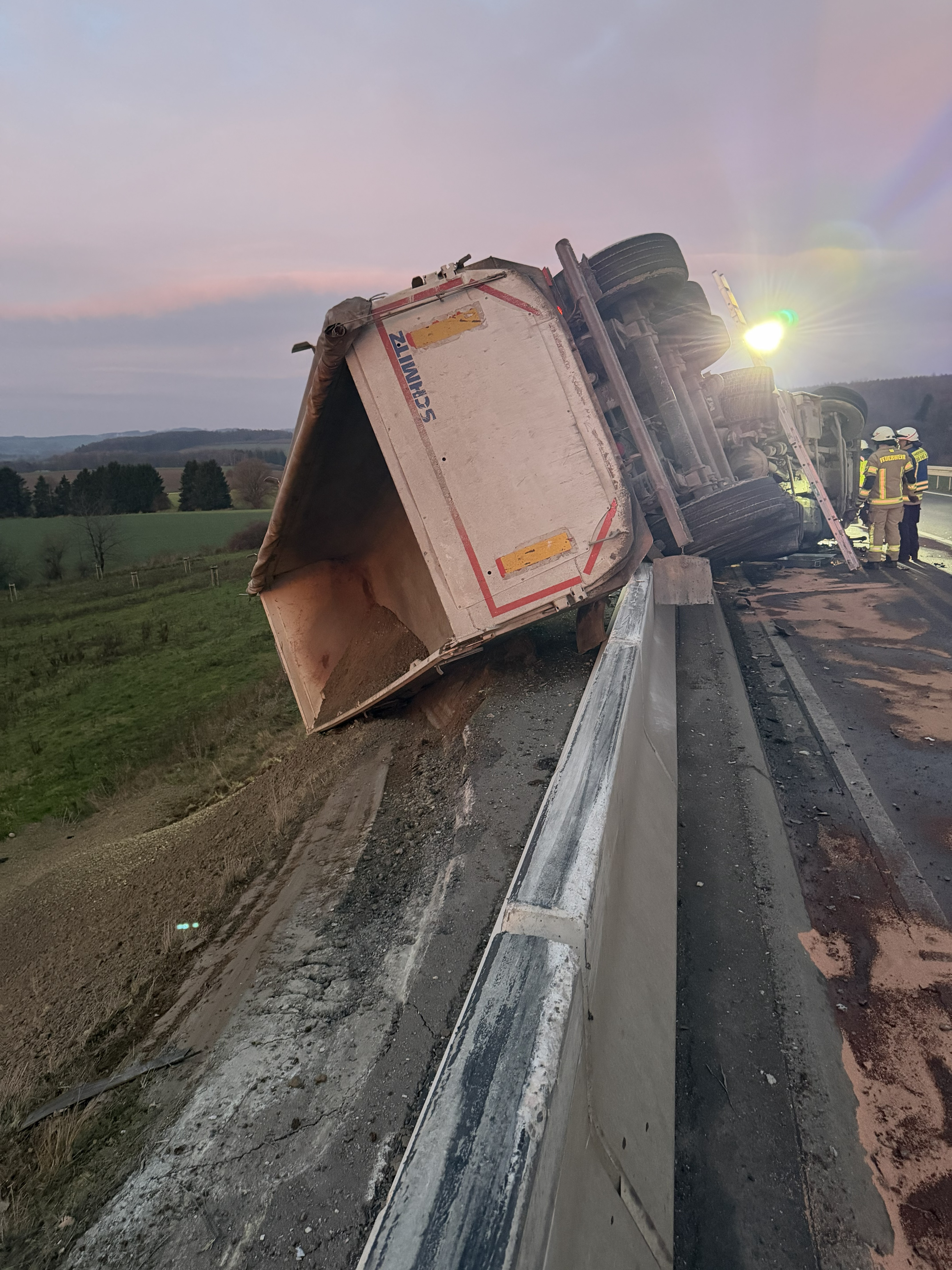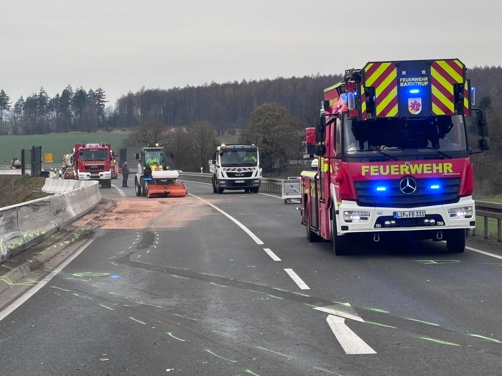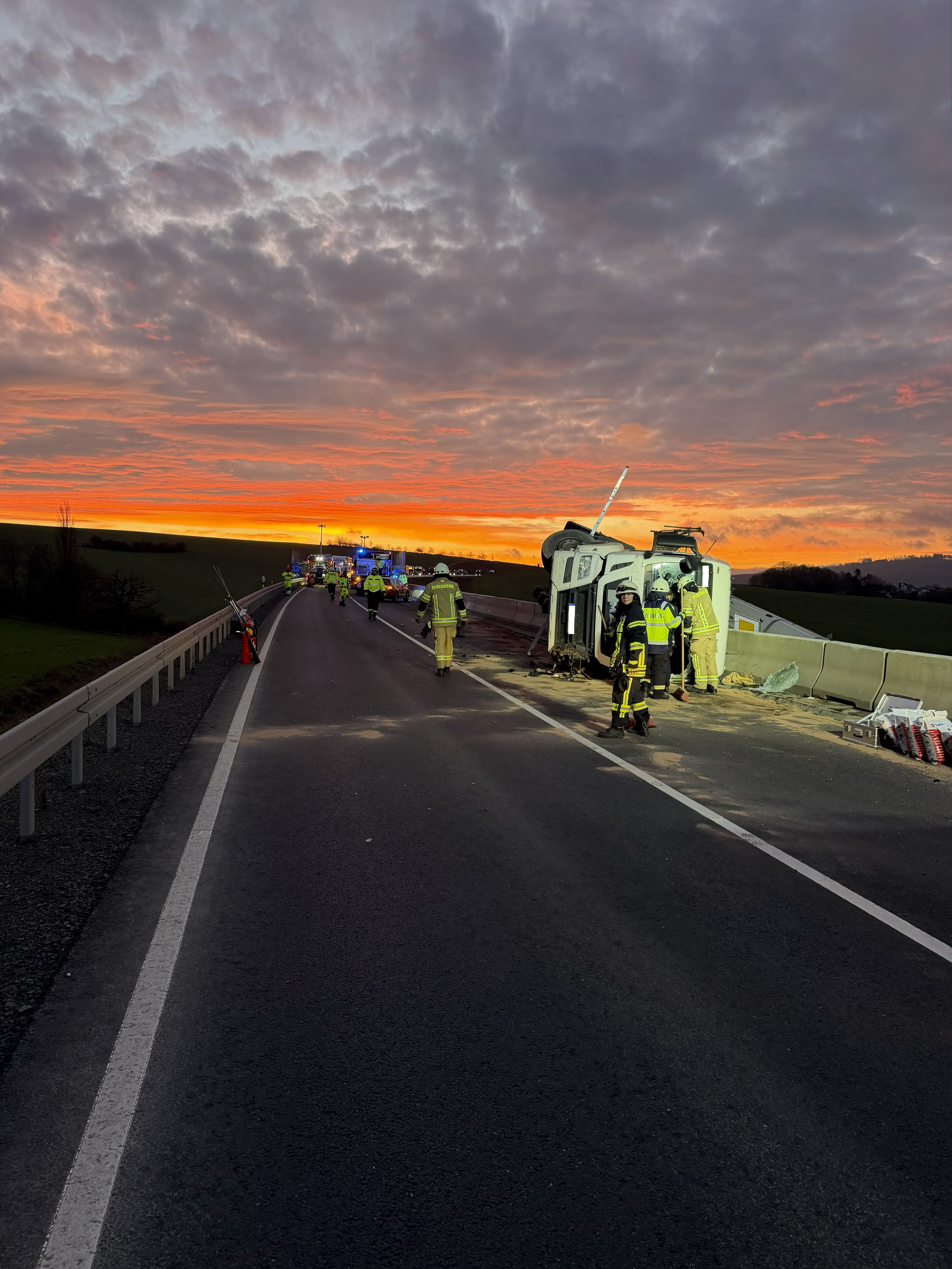 (02.12.2025) Am Dienstag Morgen wurden alle drei Einsatzabteilungen der Freiwilligen Feuerwehr Barntrup von der Feuerschutz,- und Rettungsleitstelle des Kreises Lippe mit dem Alarmstichwort „TH P-klemmt 2: VU LKW, mehrere Personen eingeklemmt, LKW gegen PKW“ nach Barntrup auf die Umgehungsstraße B66n alarmiert. Bei eintreffen der ersten Einsatzkräfte lag ein LKW über einer Betonleitplanke auf der Seite und der Fahrer war in seinem Fahrerhaus eingeschlossen. Ein PKW Fahrer war mehrere Meter weiter in seinem PKW eingeklemmt. Die Einsatzkräfte sicherten die mehrere Meter lange Einsatzstelle ab, leuchteten diese aus und stellten den Brandschutz sicher. Der LKW Fahrer konnte nach öffnen der Windschutzscheibe schnell aus seinem LKW befreit werden. Der PKW Fahrer war in seinem Fahrzeug eingeklemmt und musste nach medizinischer Erstversorgung mit hydraulischem Rettungsgerät befreit werden. Im weiteren Verlauf wurden der Dieseltank des LKW gesichert und ausgelaufene Betriebsstoffe mit Ölbindemittel abgestreut. Nach der Unfallaufnahme der Polizei, wobei auch die Drehleiter der Feuerwehr zum Einsatz kam, sowie der aufwendigen Bergung durch ein Spezialunternehmen wurde die Straße von den Einsatzkräften grob gesäubert und dem Straßenbaulastträger übergeben. In den Standorten konnte nach rund sechs Stunden Einsatz die Einsatzbereitschaft wieder hergestellt werden. Die Umgehungsstraße war im Bereich der Unfallstelle längere Stunden voll gesperrt.