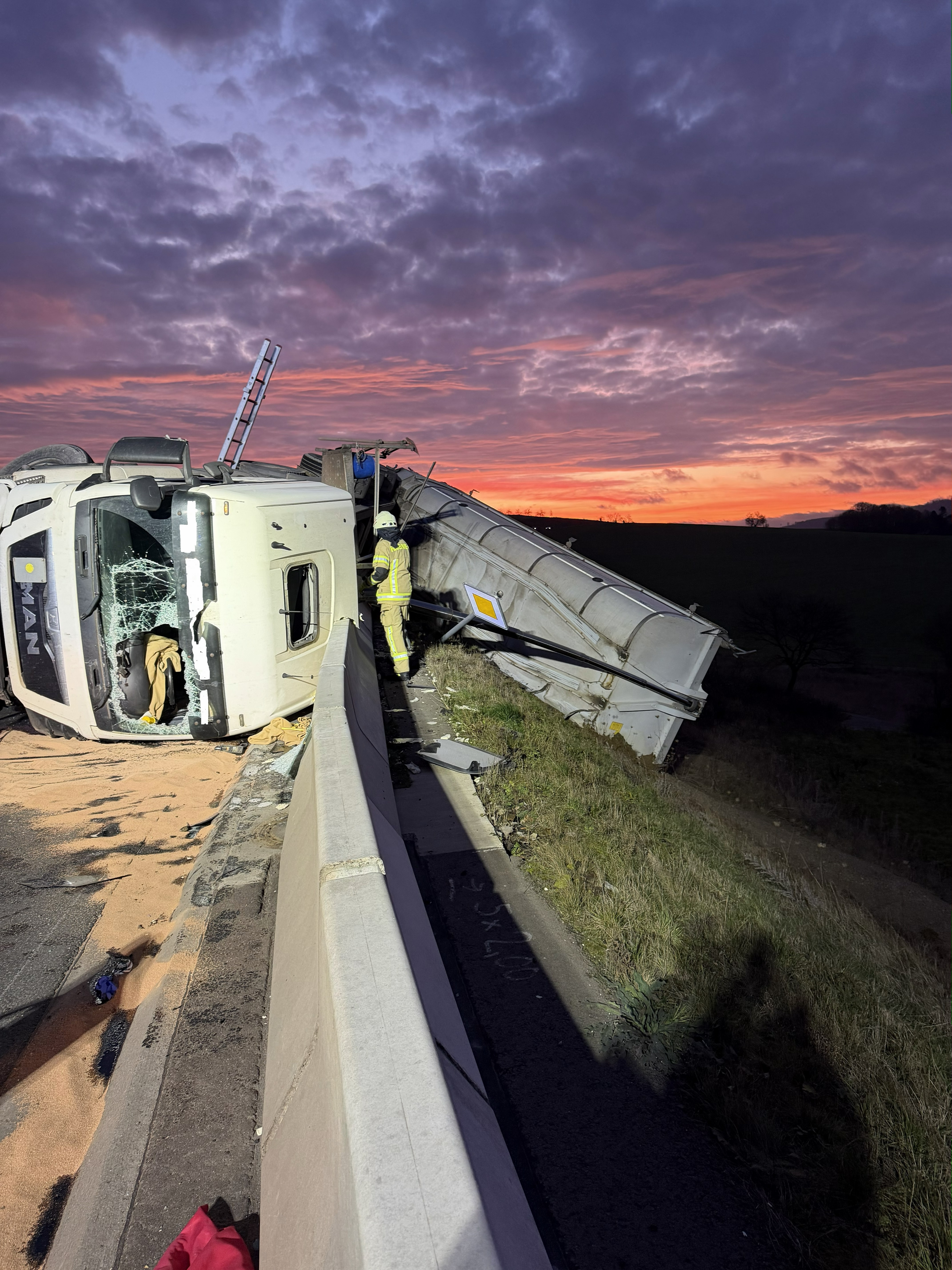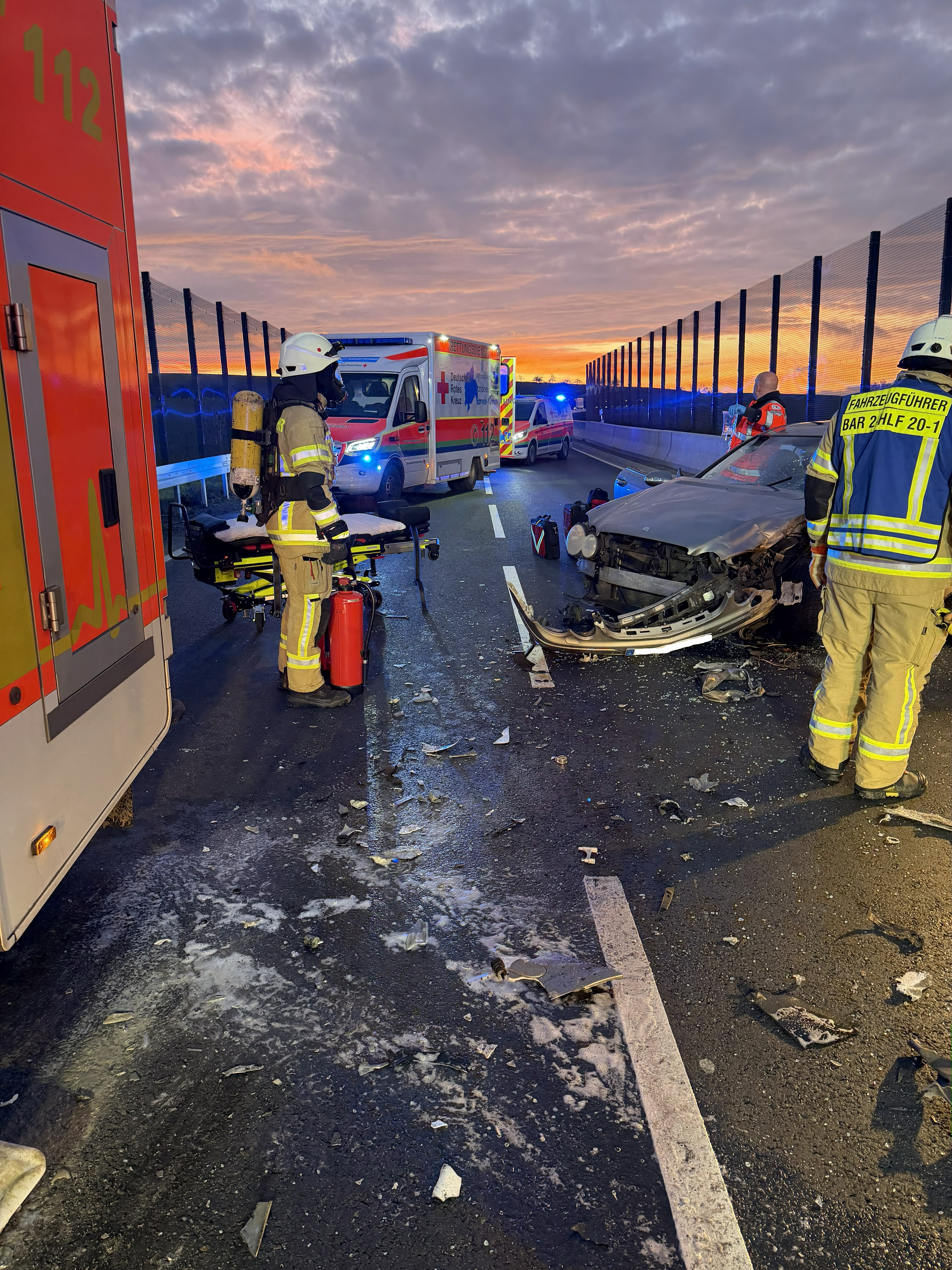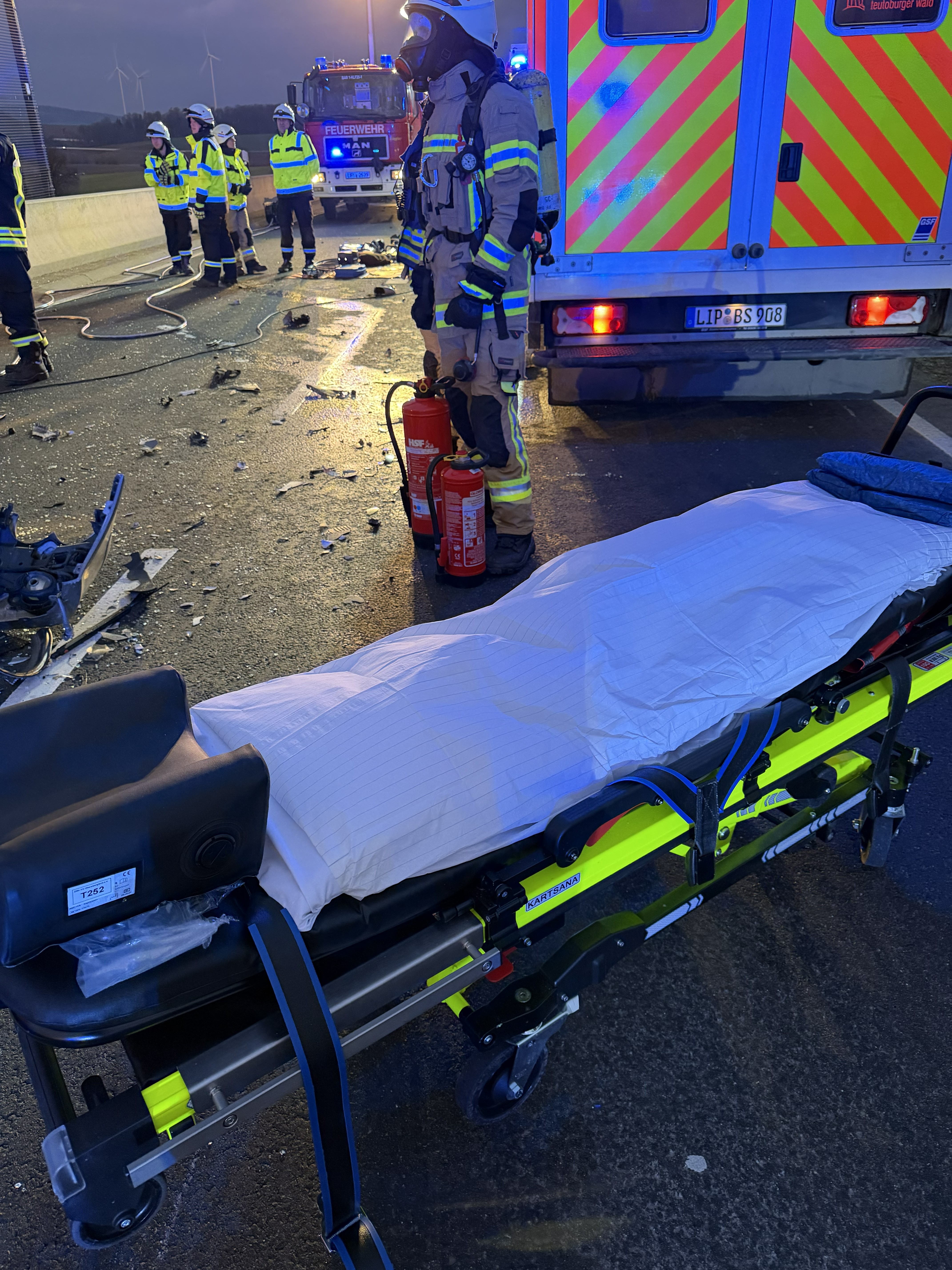 (02.12.2025) Am Dienstag Morgen wurden alle drei Einsatzabteilungen der Freiwilligen Feuerwehr Barntrup von der Feuerschutz,- und Rettungsleitstelle des Kreises Lippe mit dem Alarmstichwort „TH P-klemmt 2: VU LKW, mehrere Personen eingeklemmt, LKW gegen PKW“ nach Barntrup auf die Umgehungsstraße B66n alarmiert. Bei eintreffen der ersten Einsatzkräfte lag ein LKW über einer Betonleitplanke auf der Seite und der Fahrer war in seinem Fahrerhaus eingeschlossen. Ein PKW Fahrer war mehrere Meter weiter in seinem PKW eingeklemmt. Die Einsatzkräfte sicherten die mehrere Meter lange Einsatzstelle ab, leuchteten diese aus und stellten den Brandschutz sicher. Der LKW Fahrer konnte nach öffnen der Windschutzscheibe schnell aus seinem LKW befreit werden. Der PKW Fahrer war in seinem Fahrzeug eingeklemmt und musste nach medizinischer Erstversorgung mit hydraulischem Rettungsgerät befreit werden. Im weiteren Verlauf wurden der Dieseltank des LKW gesichert und ausgelaufene Betriebsstoffe mit Ölbindemittel abgestreut. Nach der Unfallaufnahme der Polizei, wobei auch die Drehleiter der Feuerwehr zum Einsatz kam, sowie der aufwendigen Bergung durch ein Spezialunternehmen wurde die Straße von den Einsatzkräften grob gesäubert und dem Straßenbaulastträger übergeben. In den Standorten konnte nach rund sechs Stunden Einsatz die Einsatzbereitschaft wieder hergestellt werden. Die Umgehungsstraße war im Bereich der Unfallstelle längere Stunden voll gesperrt.