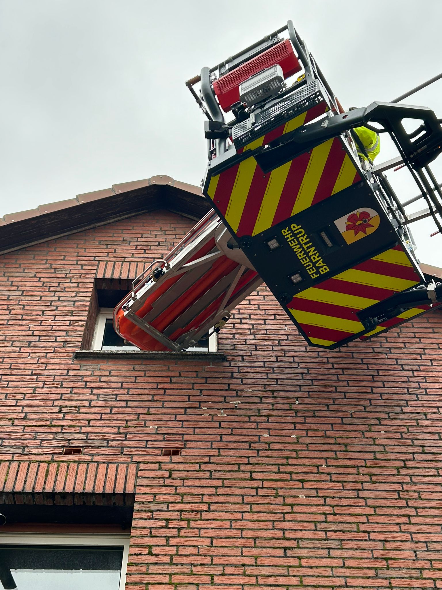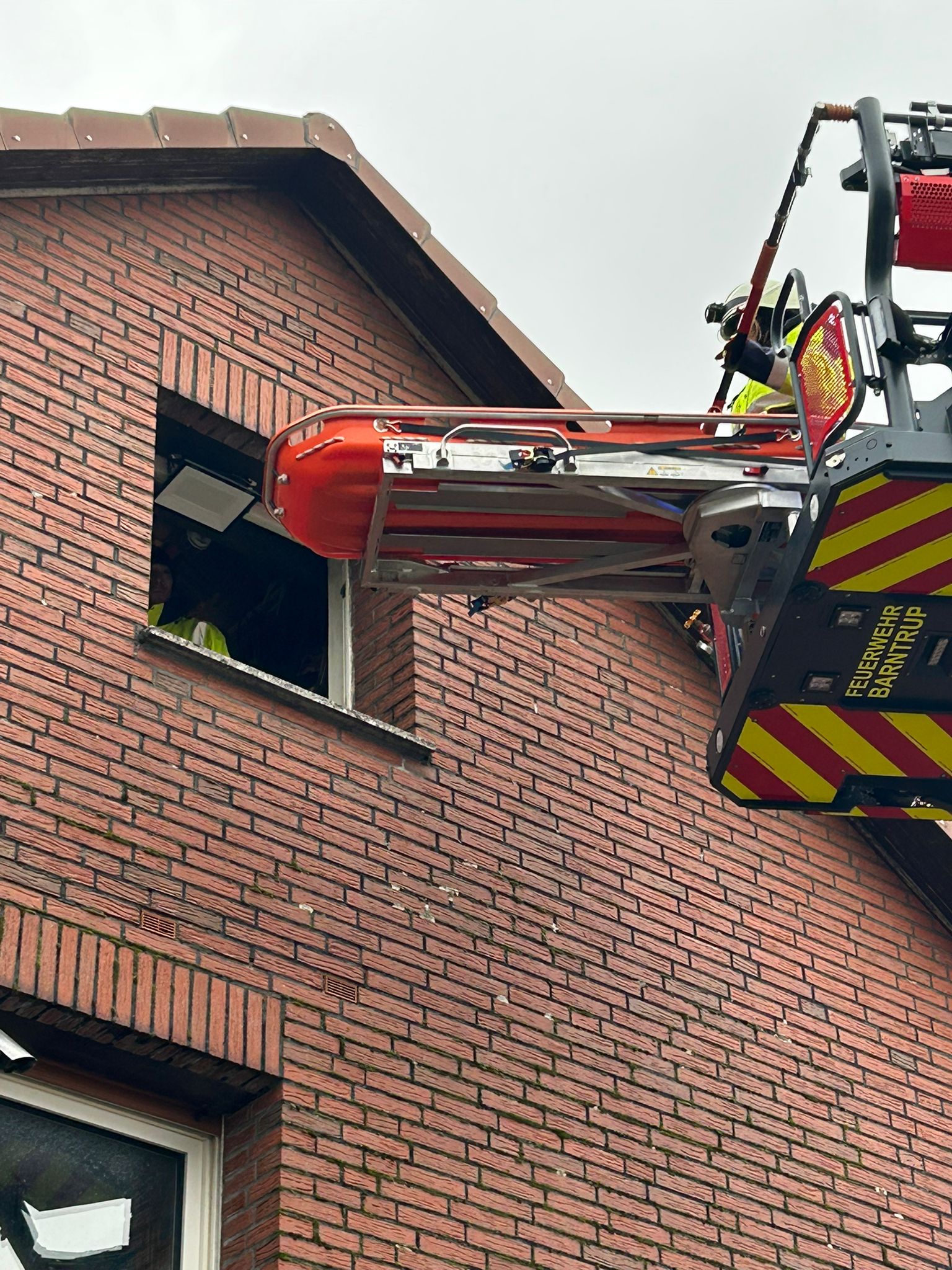 Während die ersten Einsatzkräfte die Fahrzeuge besetzten, alarmierte die Feuerschutz,- und Rettungsleitstelle 4 Minuten später bereits zum zweiten Einsatz. Dieses Mal für die Drehleiter und die Einsatzabteilung Sonneborn. Aus einem oberen Stockwerk eines Wohnhauses musste eine Person für den Rettungsdienst schonend transportiert werden. Mittels Drehleiter wurde die Person aus dem Haus zum Rettungswagen transportiert.