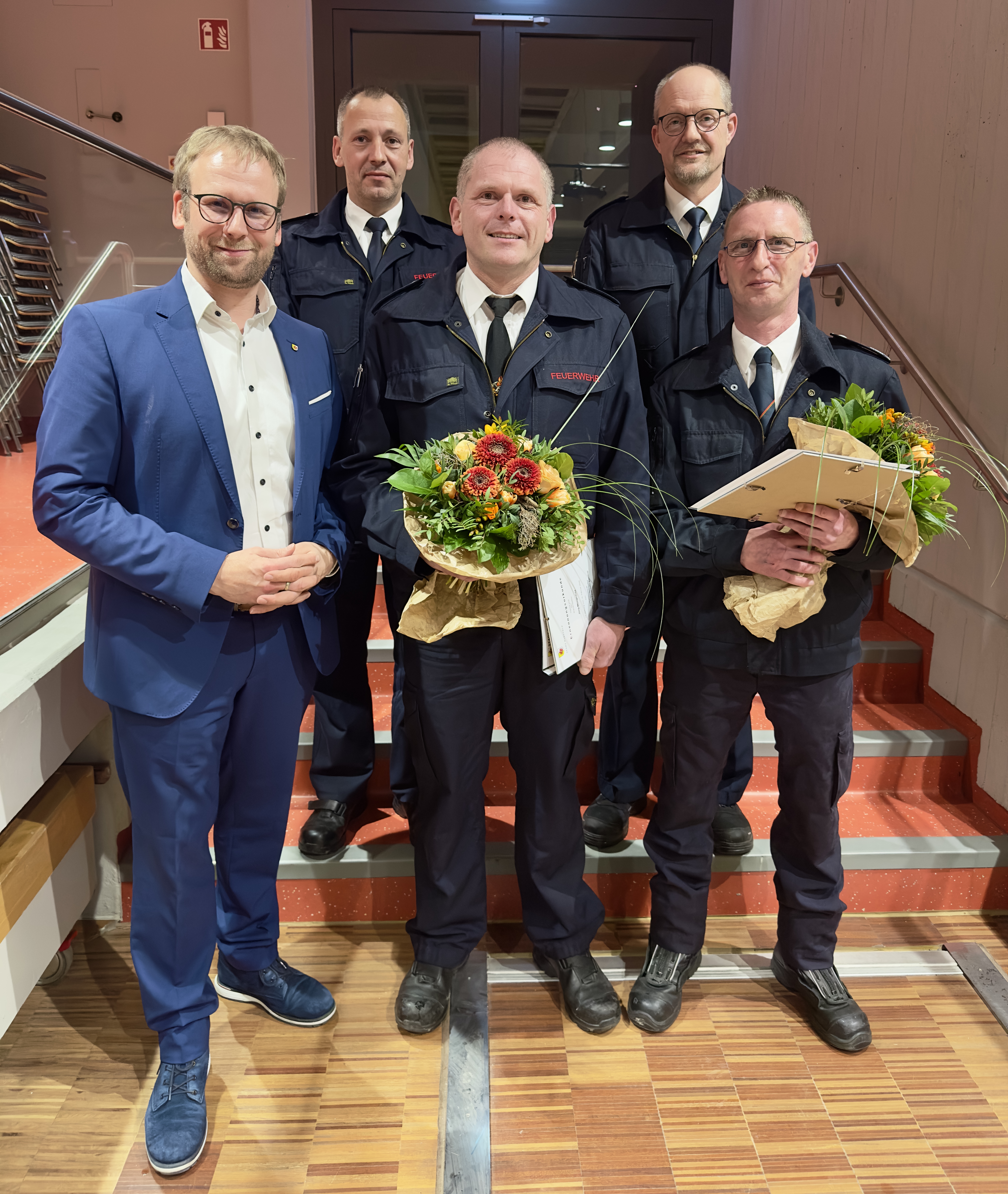 Gleichzeitig wurde Ian Thomi offiziell aus seinem Amt entlassen. Bürgermeister Ortmeier dankte ihm im Namen von Rat und Verwaltung für seinen langjährigen, engagierten Einsatz. Auch Stefan Jakob würdigte Thomis Arbeit und betonte die Herausforderungen seit Amtsbeginn im Jahr 2018 – Herausforderungen, denen sich Thomi stets mit großem Einsatz, persönlichem Engagement und Teamgeist gestellt habe. Als Anerkennung erhielt er außerdem ein Präsent der Feuerwehr.
